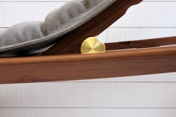 Frame solid oak or walnut, with clear varnish or black lacquered. Metal components solid brass, unvarnished or black chrome-plated. Loose neck pillow and upholstered cushion polyurethane with polyester fibre. Cover in fabric or leather. Cushion can be fixed in head and foot area with push buttons. Headboard height-adjustable at three settings. Anti-slip plastic gliders in white.