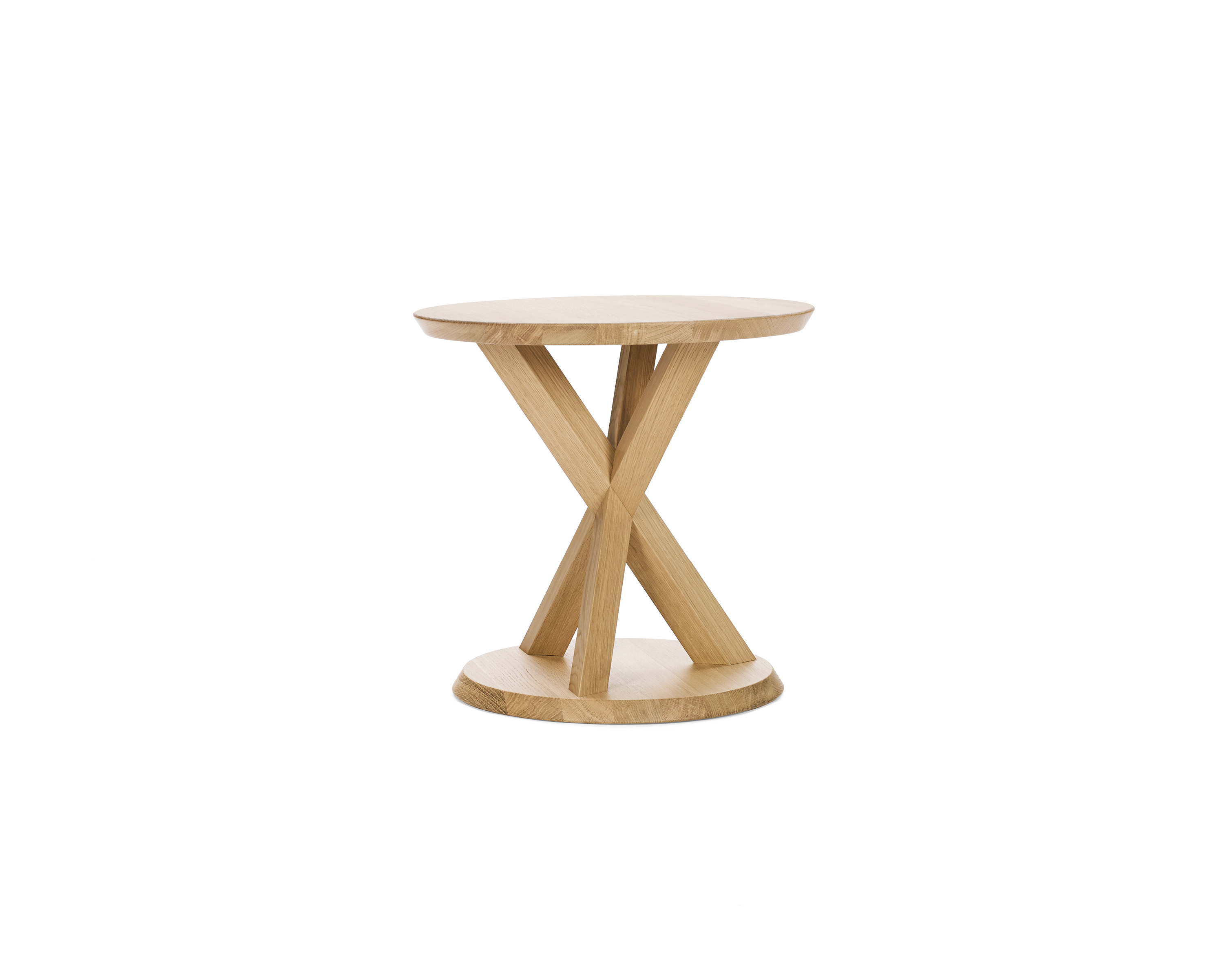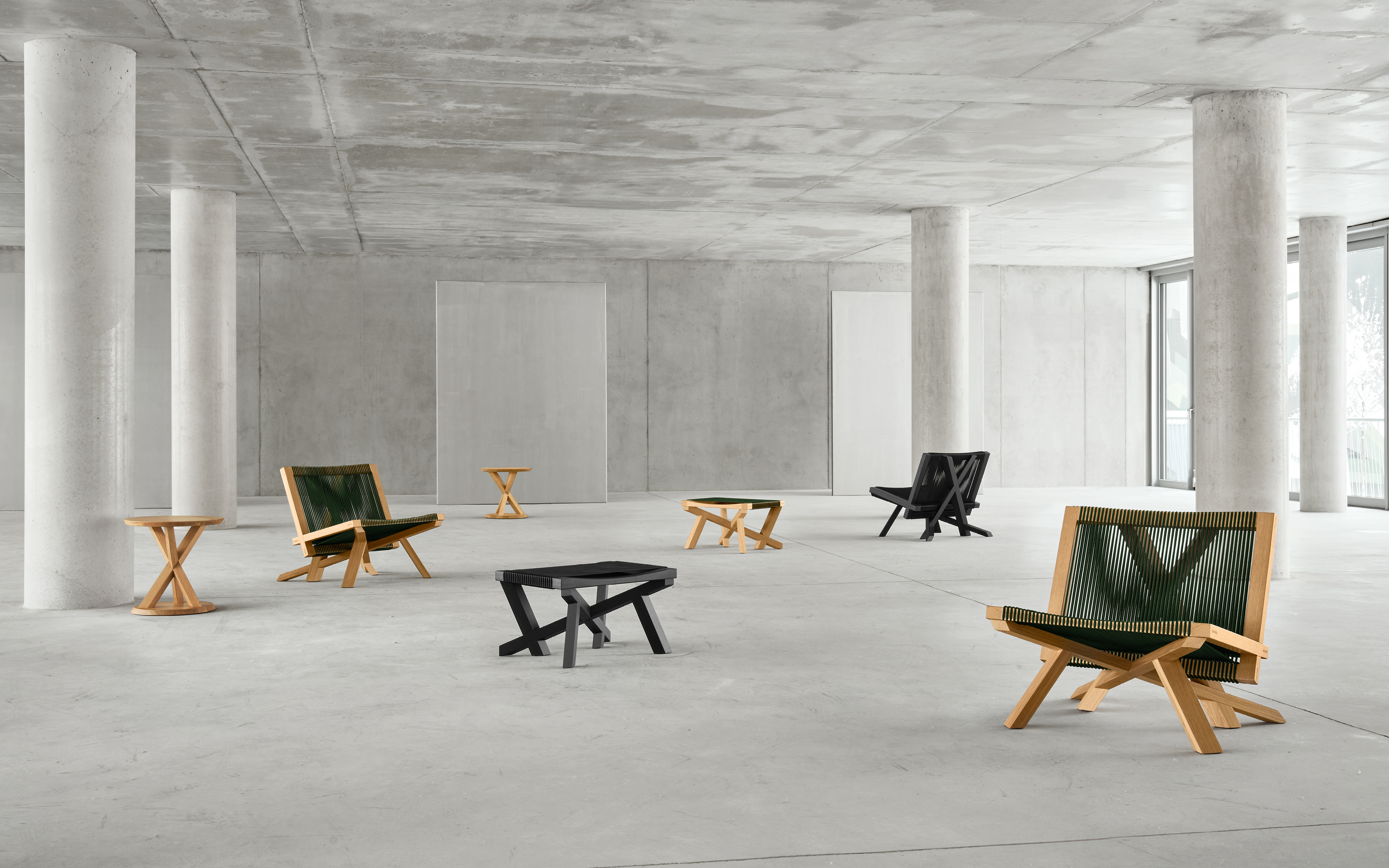 The Volkshaus range of furniture comprises a solid oak lounge chair and stool with seats and backrests of hard-wearing cord, as well as a matching side table. The complex construction of the frames with intersecting X-shapes of square timber lends the furniture its architectural expression. Due to their asymmetry, the pieces appear different from every angle. The central design feature of the series is the point at which the wooden legs intersect and interlock: this wooden connection appears simple, but is in fact highly complex. It was developed during a comprehensive research process by Herzog [&] de Meuron. Inspired by traditional wooden joints in Japanese architecture, this ingenious construction principle lends the furniture its sculptural character. The Volkshaus series is perfect wherever relaxed seating is desired – in personal interiors or in prestigious waiting areas, lobbies or hotel rooms. The Lounge Chair, Stool and Side Table can be found, for example, in the Volkshaus Basel boutique hotel, which was designed by Herzog [&] de Meuron and to which the collection owes its name.
