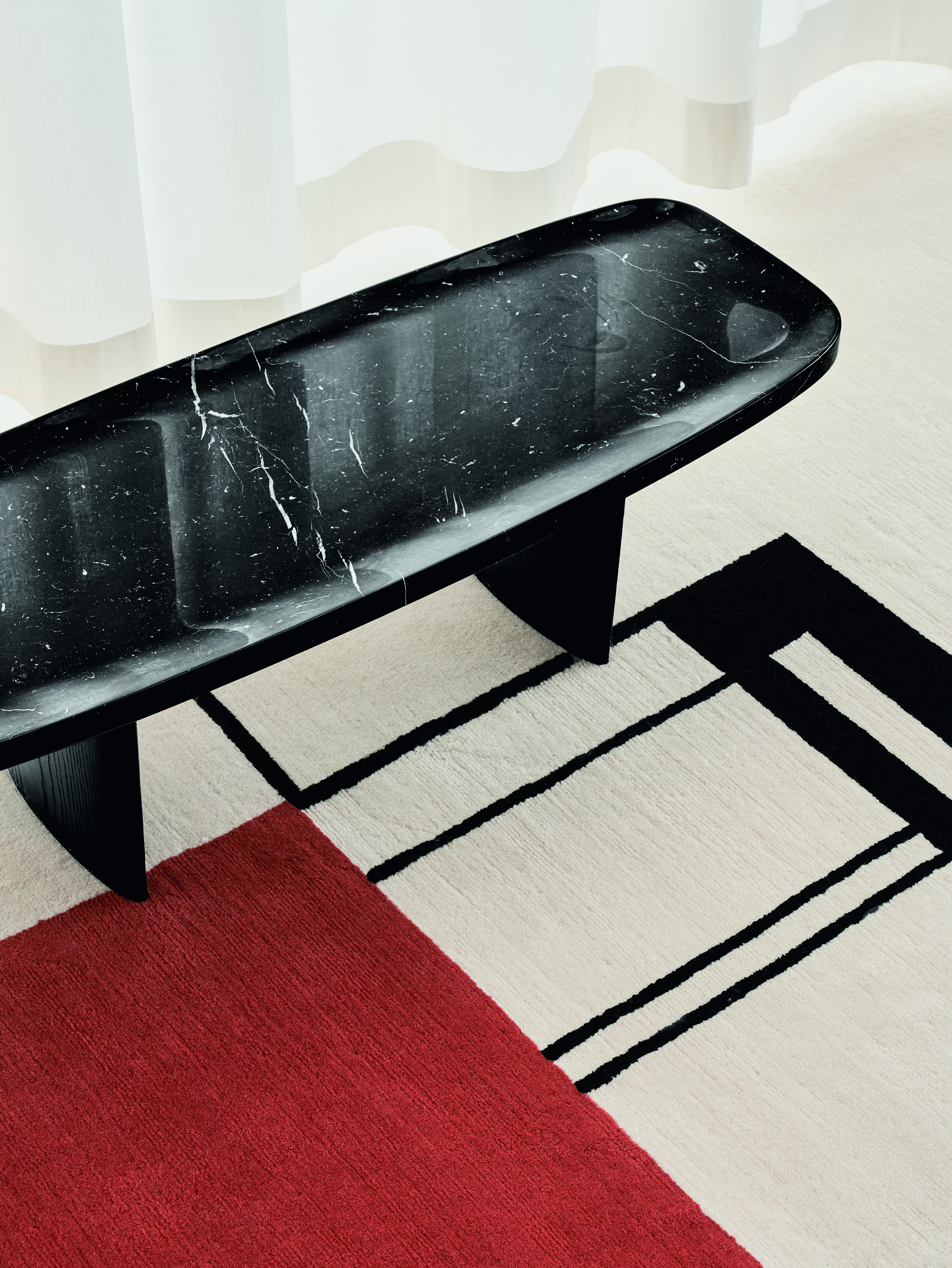 Marble plays a versatile role in our portfolio, often paired in striking contrast with materials such as steel or wood. In his Bow Coffee Table No. 3, Guilherme Torres translates stylistic elements from the 1970s into a contemporary design. A slender, polished marble top rests on a steel or brass sheet base with rounded corners. Contrasting materials also define the marble edition of Christian Haas’s Matéria Lowboard series where a table top in deep black Nero Marquina blends harmoniously with a frame made of black lacquered ash.